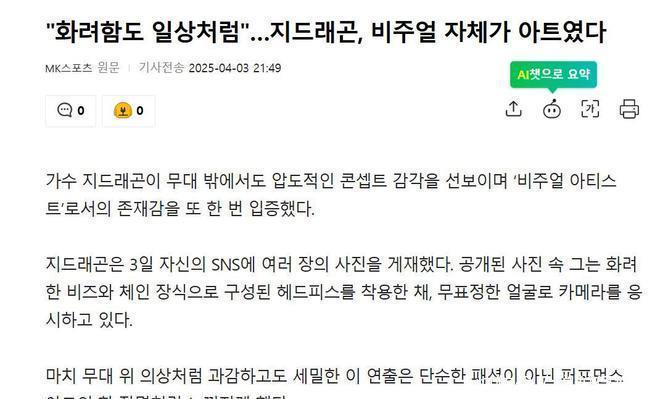值得一提的是,权志龙刚刚在上个月29日和30日于高阳综合运动场成功举办了“2025世界巡演——Weverse Maniac”。但即便演出结束,他依然通过SNS延续着自己的艺术概念,不断强化作为视觉艺术家的形象。这种从舞台到私生活的无缝衔接,真的只有权志龙能做到吧! 看完这组照片,小娱只能说:权志龙的时尚感和艺术表现力,真的永远在线!宝子们,对于韩星权志龙展现“视觉艺术家”的存在感,大家怎么看呢?你们被龙哥这波操作惊艳到了吗?快来评论区聊聊你的感受吧!别忘了点赞关注,我们下期再见~